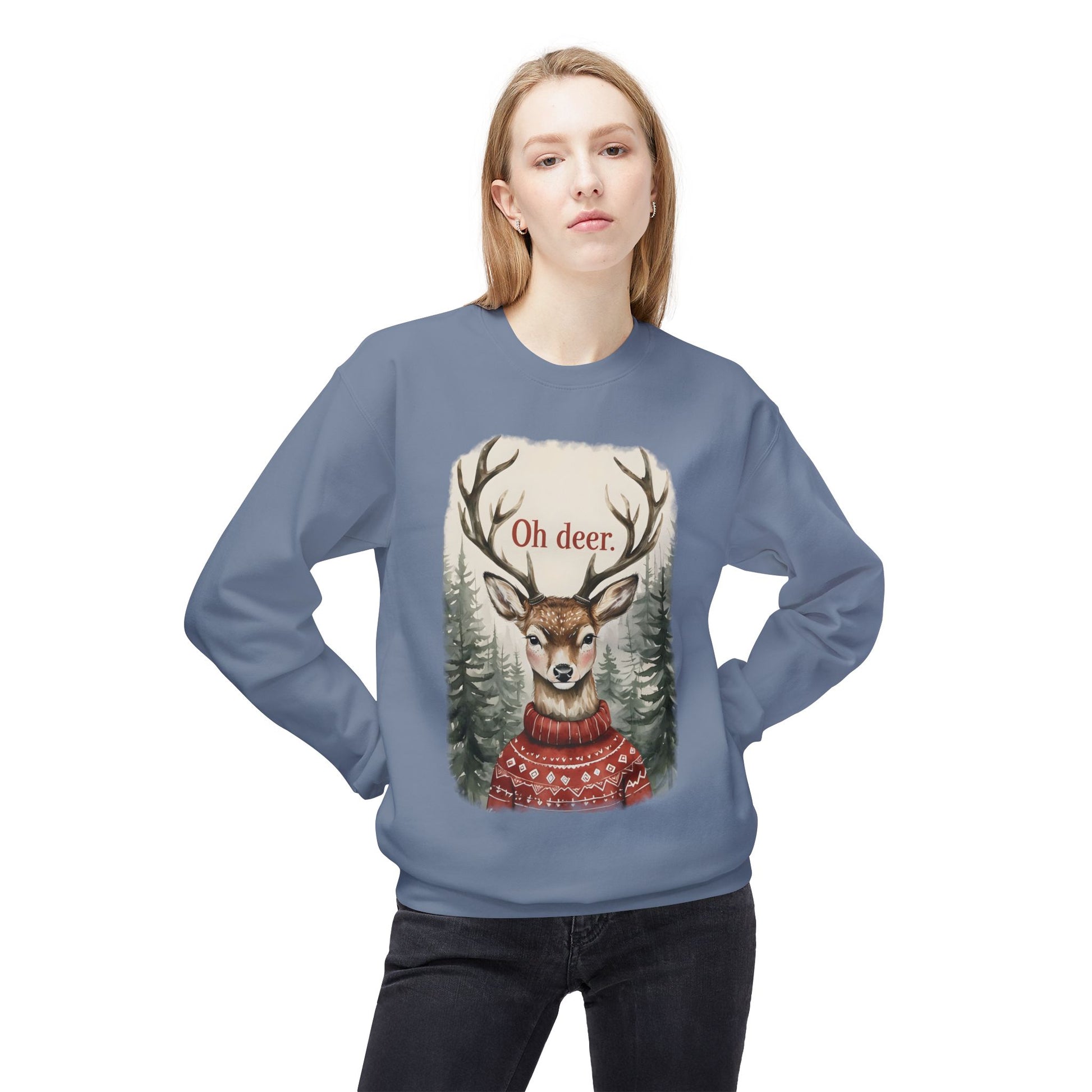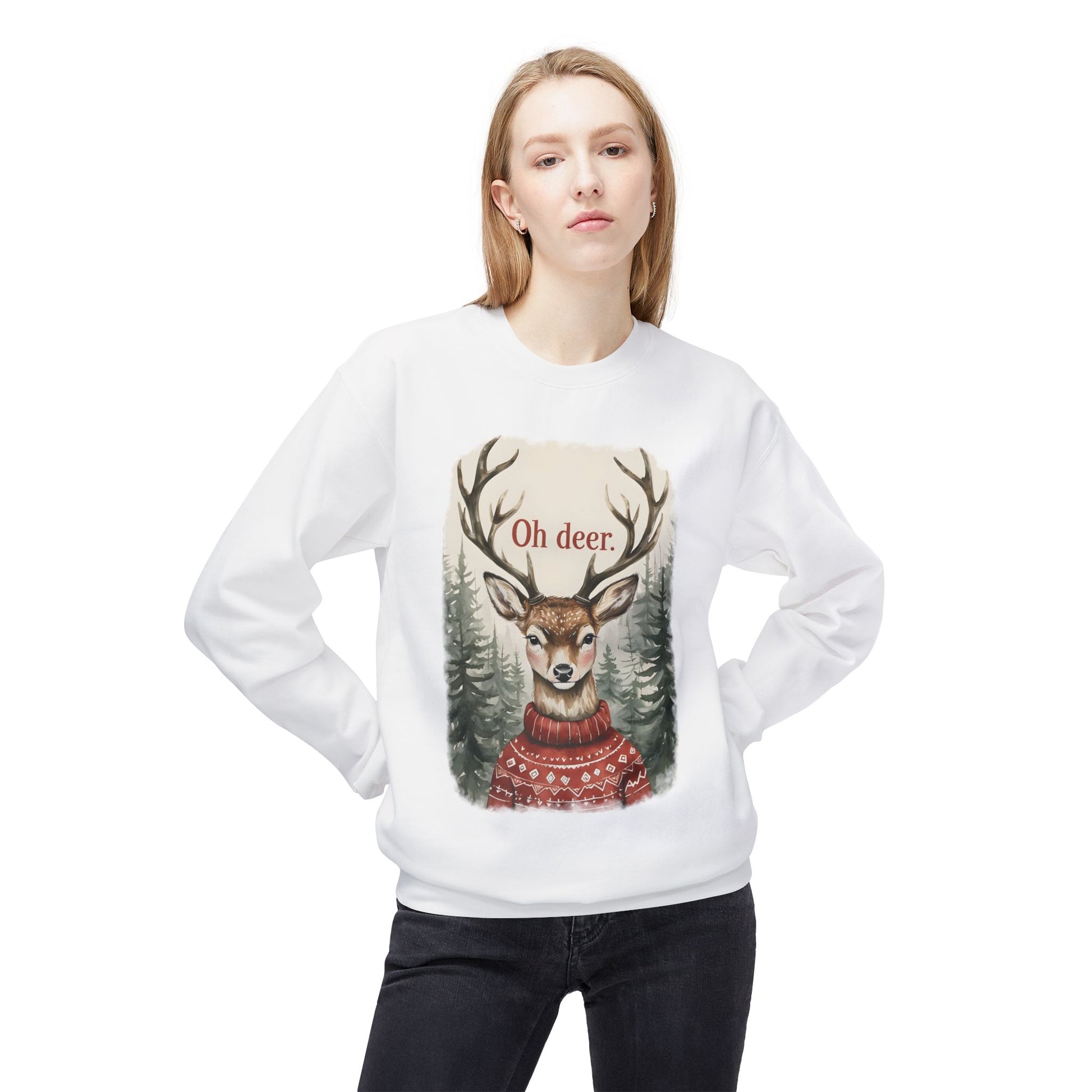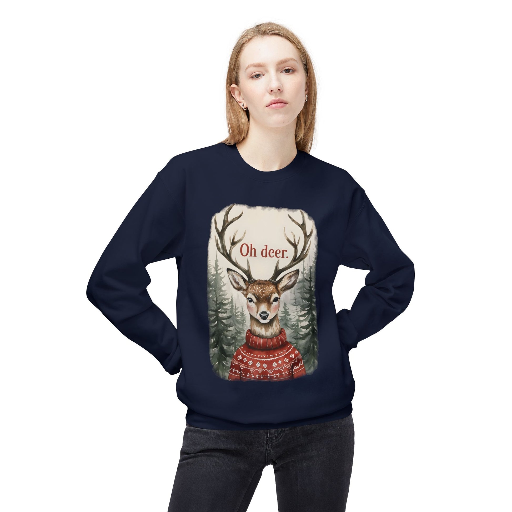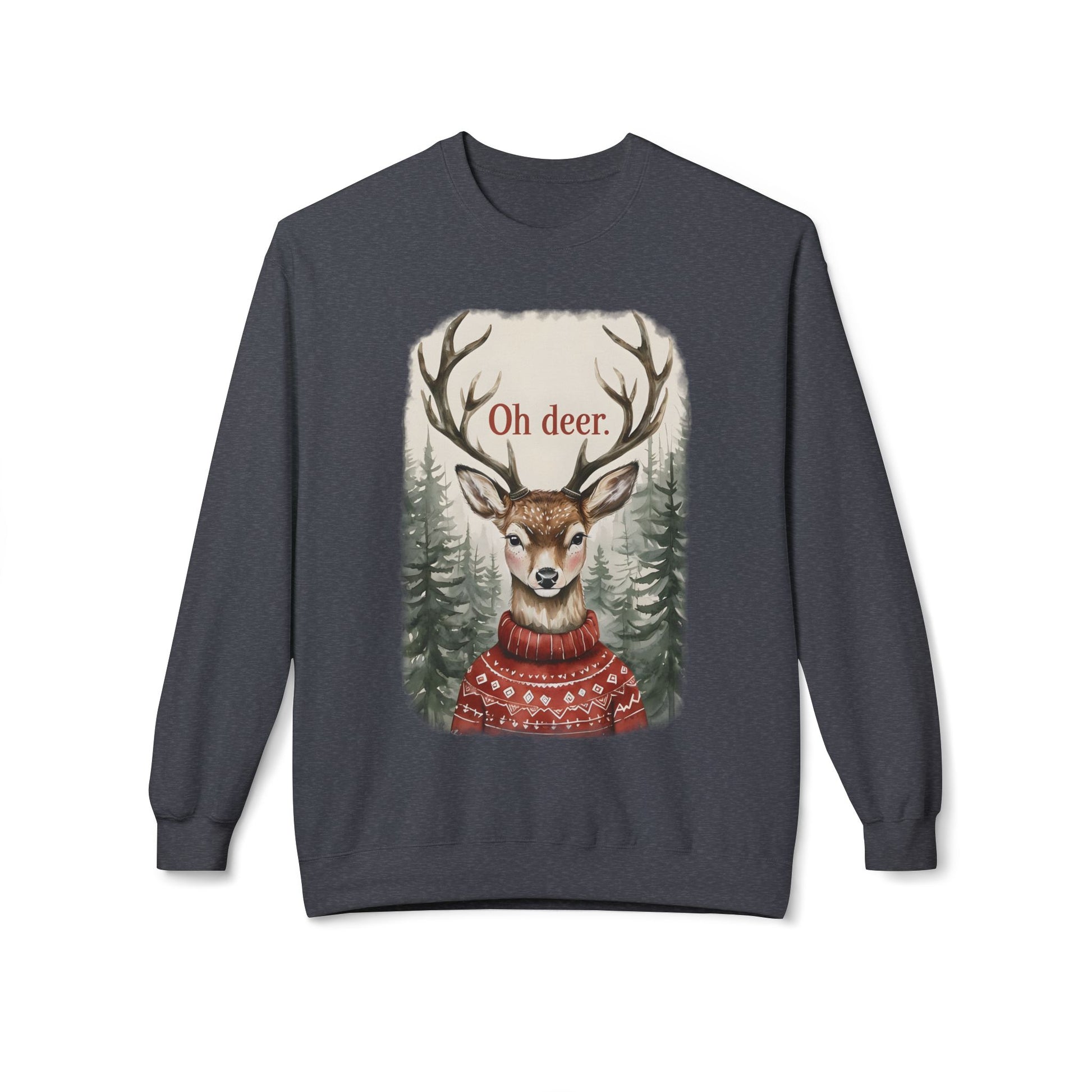 Embrace cozy vibes with this unisex midweight softstyle fleece crewneck sweatshirt, perfect for winter gatherings or a relaxed day at home. Its charming design features a whimsical deer graphic, adding a playful touch to your wardrobe. Ideal for holiday celebrations, casual outings, or gifting to friends and family who appreciate unique, comfortable style. This sweatshirt resonates with nature lovers and those who enjoy a lighthearted aesthetic. Pair it with jeans or lounge pants for effortless styling, ensuring you stay warm and stylish all season long.